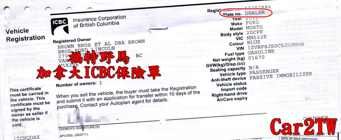 上圖是一台福特野馬跑車,車主留學生從加拿大溫哥華運車回台灣,根據台灣車輛安全審驗中心VSCC規定,美國回台灣進口車輛必須提供TITLE(也叫車主證),加拿大運車回台灣必須提供車輛保險證明文件,那這位加拿大福特野馬車主提供的ICBC保單怎麼會不行呢? 車輛安全審驗中心VSCC說"Plate no. Dealer"不行,Plate no.後面必須車牌數字(123456),不行是英文Dealer。問題是車都出口回台灣了,怎麼回去改啊?交通部安審法規完全沒有規定Plate no.後面必須是車牌數字(123456),英文Dealer不行(美國很喜歡用個人名稱當車牌,難道車牌上不行寫Dealer嗎?),重點是前一位VSCC主管說可以,新的主管改口說不行,只能想到原來官大學問大,不行就是不行,一句話就可以讓一台車報廢。